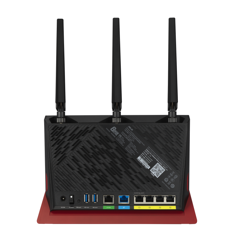 RT-AX86U 雙頻 WiFi 6 (802.11ax) 電競無線路由器,經 NVIDIA GeForce NOW認證推薦,配有2.5G電競專用埠,三段遊戲加速功能,並支援AiMesh全屋覆蓋無線系統,內建終身免費的 AiProtection Pro 網路安全防護,及Open NAT連接埠轉送功能,及一鍵開啟的手遊加速模式