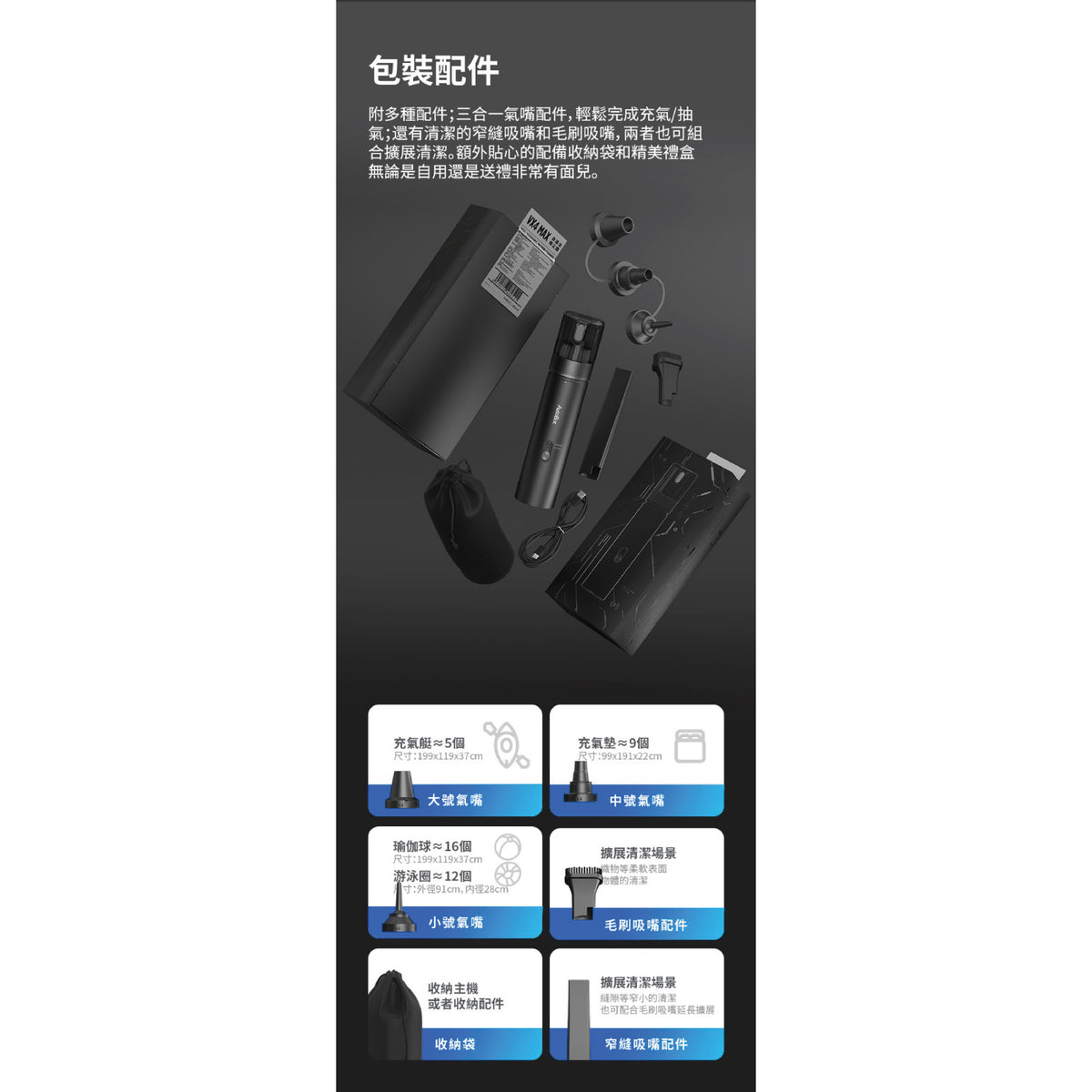 最新推出VX4 Max,集三大模式(自動清潔,吸塵,吹氣) 自動清潔模式可有效清潔濾芯。強力模式吸力達20000pa。超長續航可使用70分鐘。隨機附送多個小配件,車用、家用或充氣泵都可以!