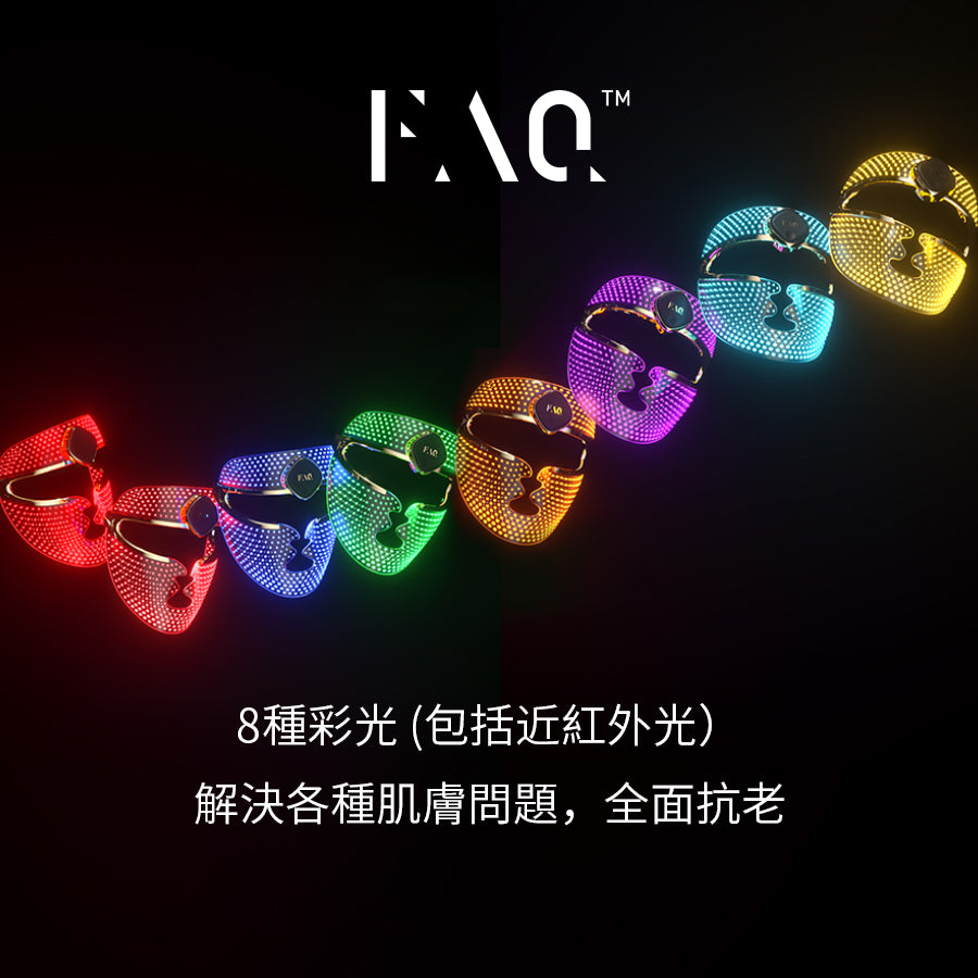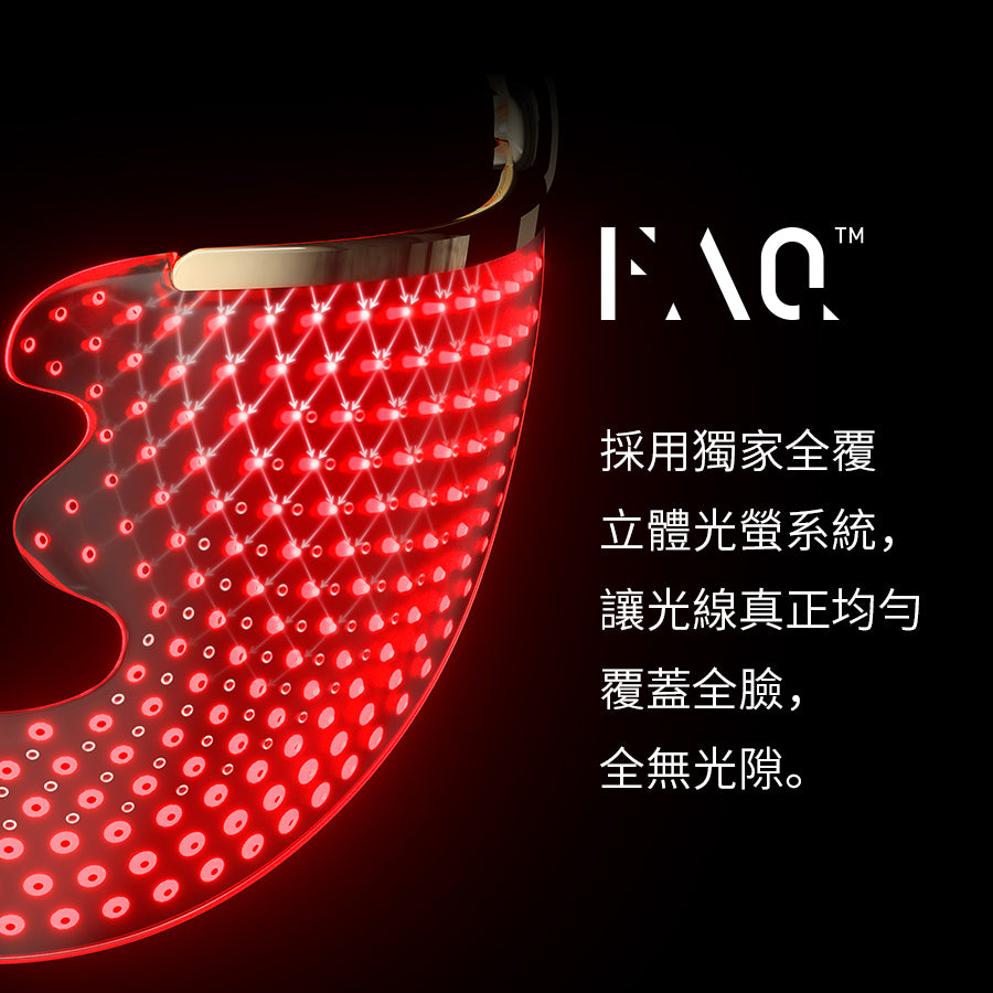 FAQ™202 針對熟齡肌所產生的皺紋、鬆弛、暗沉等一系列肌膚問題,集合7種不同顏色彩光及近紅外光,以每秒高達 3000 次的高頻閃衝光深層激活皮膚潛能,全面擊退肌膚老化痕跡。獨家立體全覆光療系統加乘高透光矽膠交織出密光網,光線均勻覆蓋面部。超輕量無線設計帶來前所未有的自由美膚體驗。開放式眼周設計,確保眼部安全及使用舒適。連接智能 APP ,滿足個性化美膚需求。