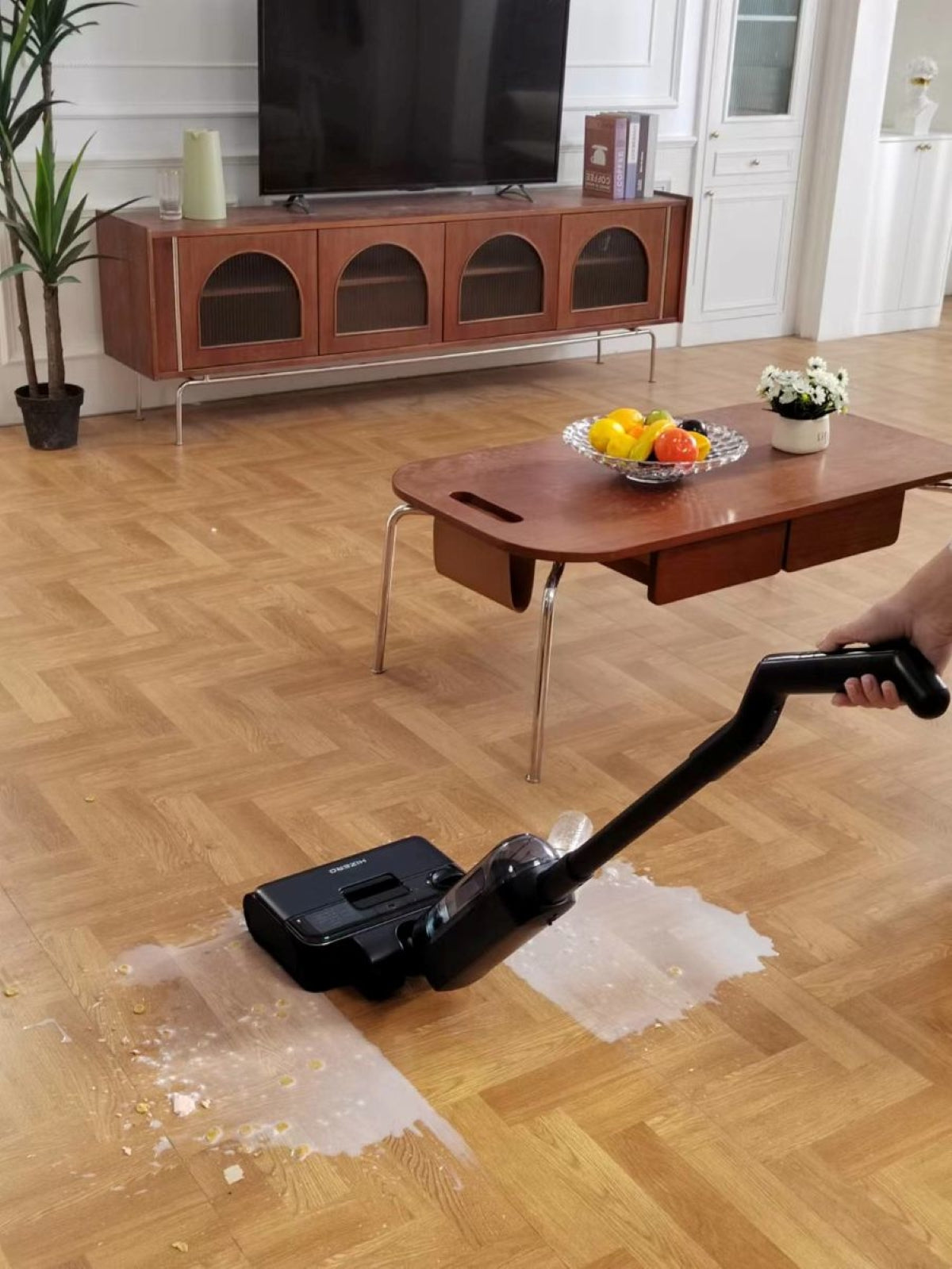 「一次過」掃地、拖地、抹地及自我清潔。專利技術「液固廢物自動分離」。操作寧靜,噪音小於 60 db。操作省電,一次充滿約可連續使用 80 分鐘。不會如「真空吸塵機」有機會釋出灰塵或過敏原。